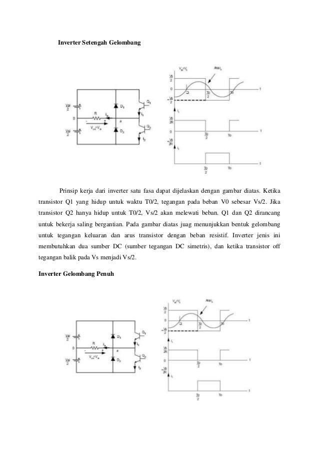 Berikut ini kedua jenis skema inverter setengah gelombang dan rangkaian inverter gelombang penuh Inverter setengah gelombang Inverter satu fasa dengan prinsip kerja setengah gelombang dapat diamati pada skema dibawah ini ini dimana komponen yang digunakan pada dasarnya terdiri dari 2 buah transistor dan 2 dioda yang akan menghasilkan tegangan